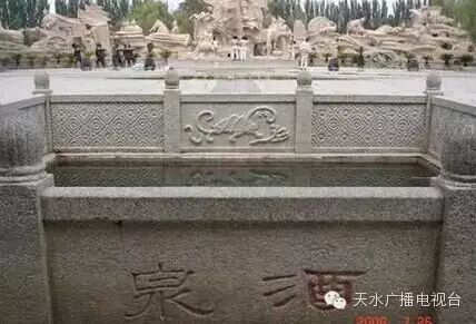 在酒泉城東一公里處,是一座清宣統辛亥3月立的大碑,碑面刻有西漢酒泉勝跡”6個剛勁的大字。石碑后有一清泉,名曰酒泉”,距今已有二千年的歷史。據傳,漢將霍去病在江江河西擊敗了匈奴,捷報傳到長安,漢武帝賞賜御酒一壇。霍去病為讓將士們共嘗美酒,下令將御酒倒入金泉之中,讓3軍暢飲。從此,金泉泉水便帶有濃重的酒香,故名酒泉”。還有學者認為,酒泉郡名,系以泉命名,具體說是因武帝初東方朔所著《神異經》記載西北荒中有一其味如酒的酒泉而得名。