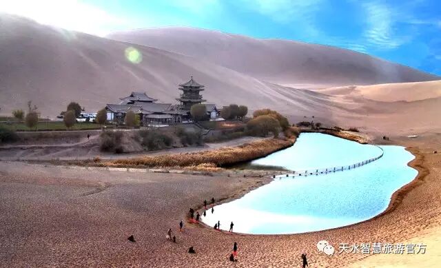 鳴沙山月牙泉景區(qū)位于城南7公里鳴沙山北麓。月牙泉形似月牙,南岸有茂密的蘆葦,四周被流沙環(huán)抱,雖遇強(qiáng)風(fēng)而泉不為沙所掩蓋。因“泉映月而無(wú)塵”、“亙古沙不填泉,泉不涸竭”而成為奇觀。